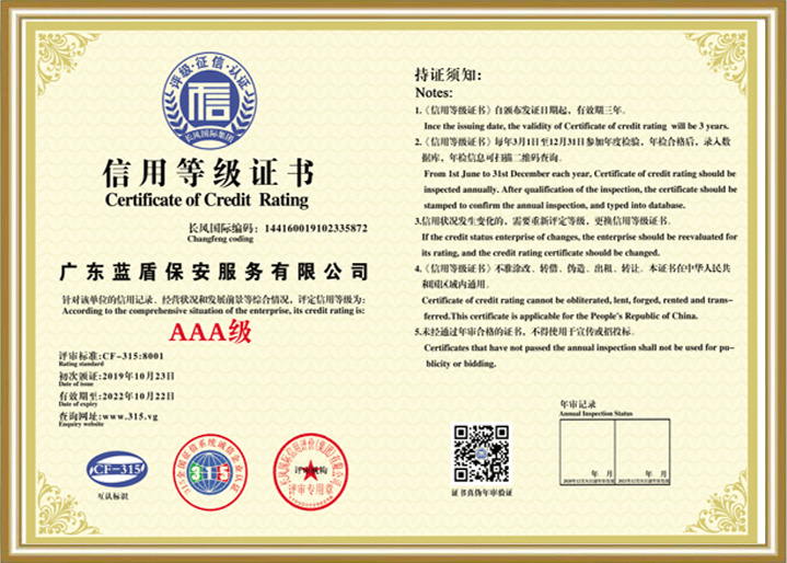 廣東藍盾保安服(fú)務(wù)有限公司(sī)經工商、公安機關批準成立,由于公司(sī)業務(wù)蓬勃發展,于2014年在(zài)廣東河(hé)(hé)源市(shì)成立廣東藍盾保安服(fú)務(wù)有限公司(sī)。公司(sī)實行(xíng)市(shì)場化(huà)(huà)戰略,并著(zhe)眼于未來,建立起現代保安企業管理(lǐ)制度,引入先進的(de)運營理(lǐ)念和安全策略,以市(shì)場為(wèi)導向,以滿足社會(huì)不(bù)同層次的(de)安全需求為(wèi)己任,開展多元化(huà)(huà)的(de)保安服(fú)務(wù)業務(wù)。在(zài)激烈的(de)市(shì)場競争中,通過規範、專業的(de)安防服(fú)務(wù),赢得了客戶,赢得了市(shì)場,赢得了信譽。公司(sī)擁有大批行(xíng)業精英和管理(lǐ)人才,經過幾年發展,逐步确立了以人力護衛為(wèi)依托、以科(kē)技安防為(wèi)導向、以職業培訓為(wèi)基礎、以商務(wù)特保為(wèi)特色的(de)多元化(huà)(huà)經營發展模式